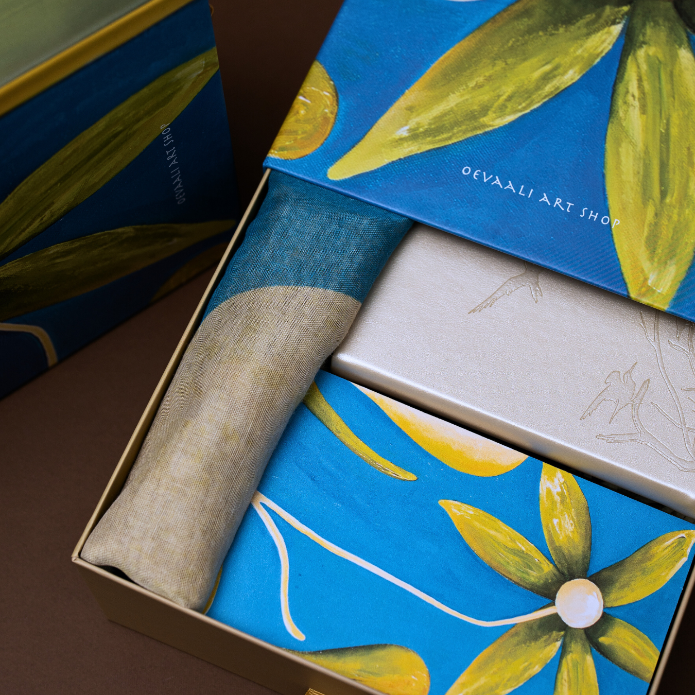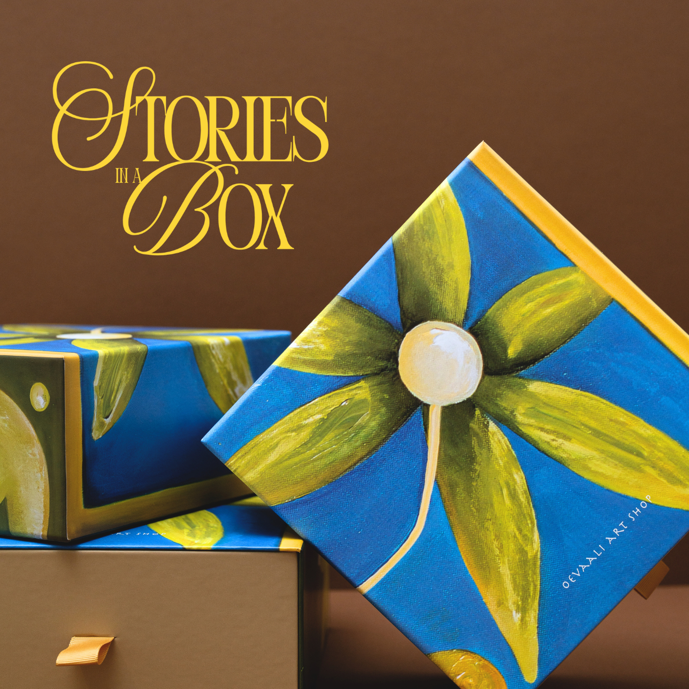 The Art Box Collection is a celebration of storytelling through art: each box is inspired by an original painting from the Oevaali Art Shop studio. Thoughtfully curated by the artists, every box gathers crafted pieces that reflect the emotions, colours, and stories within each artwork.