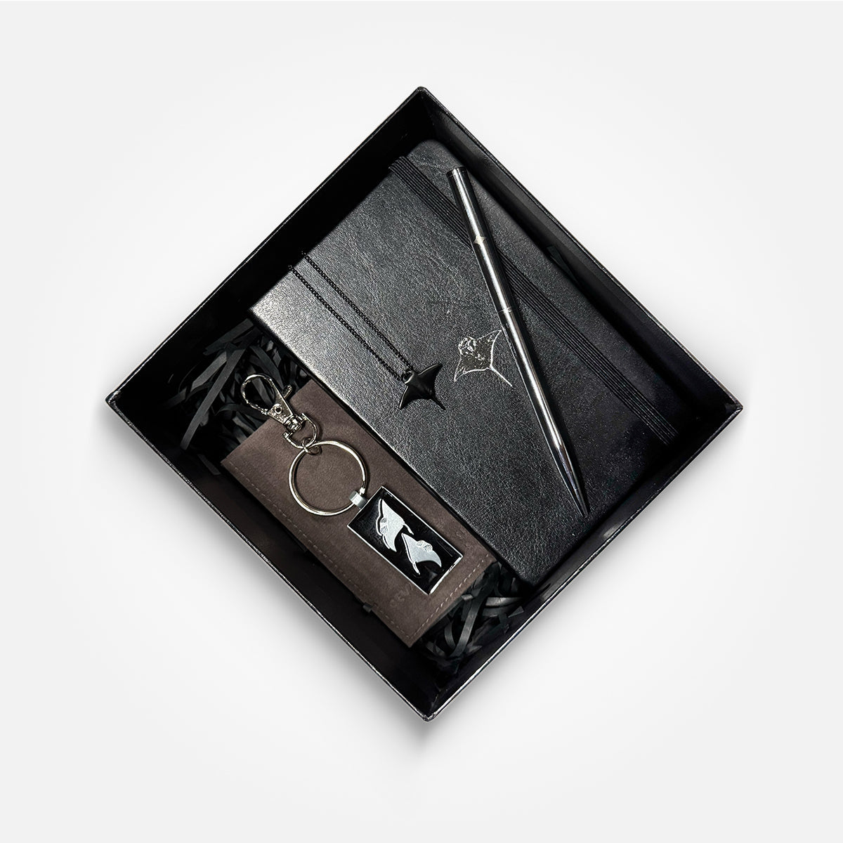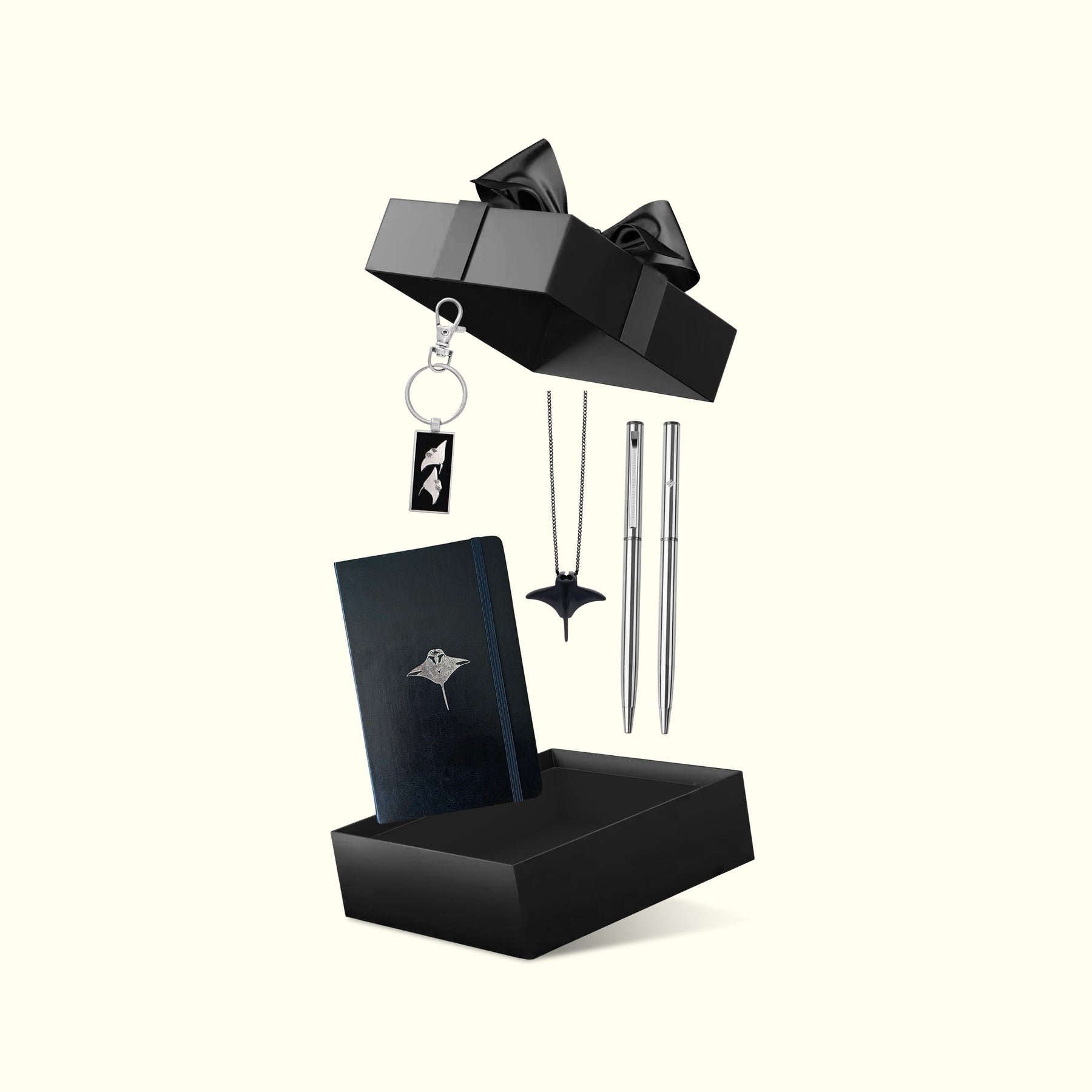 A mix of practical and statement pieces.This gift set includes the Manta Ray Notebook (A6/Blank) with a matching silver Pen, Manta Ray Pendant in brushed black, and a Two Mantas Keychain in antique silver and black.