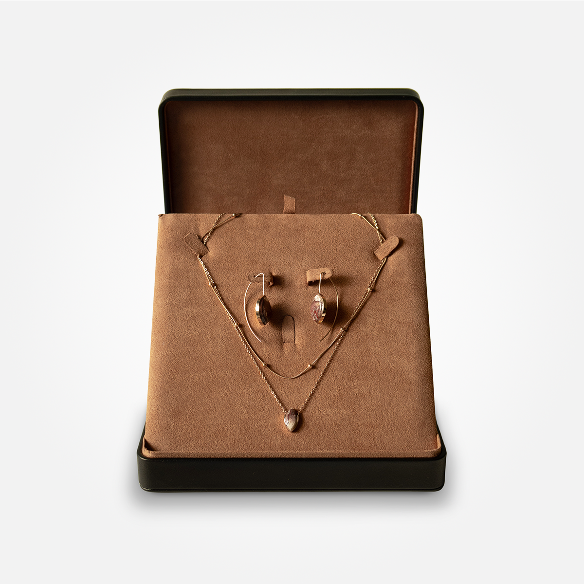 A dreamy and graceful combination in rose gold, featuring a marquis-cut Lace Agate necklace and matching curved earrings, complemented by a delicate bead chain in rosegold. The soft purple hues of Lace Agate symbolize tranquility and feminine strength. Presented in a jewelry set box with an Amethyst ribbon, this set is an ode to elegance.