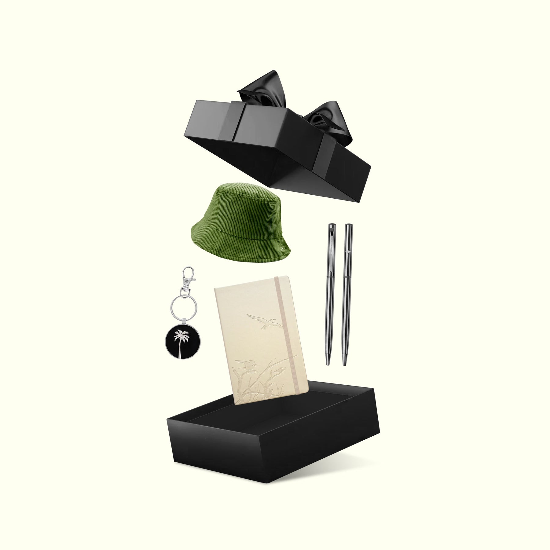 A curated mix of everyday favourites with understated details. This gift set includes the Daybreak Notebook (A5 / Ruled), Manta Ray Pen in gunmetal, an Olive corduroy bucket hat, and a Coconut Palm Round Keychain in antique silver and black.
