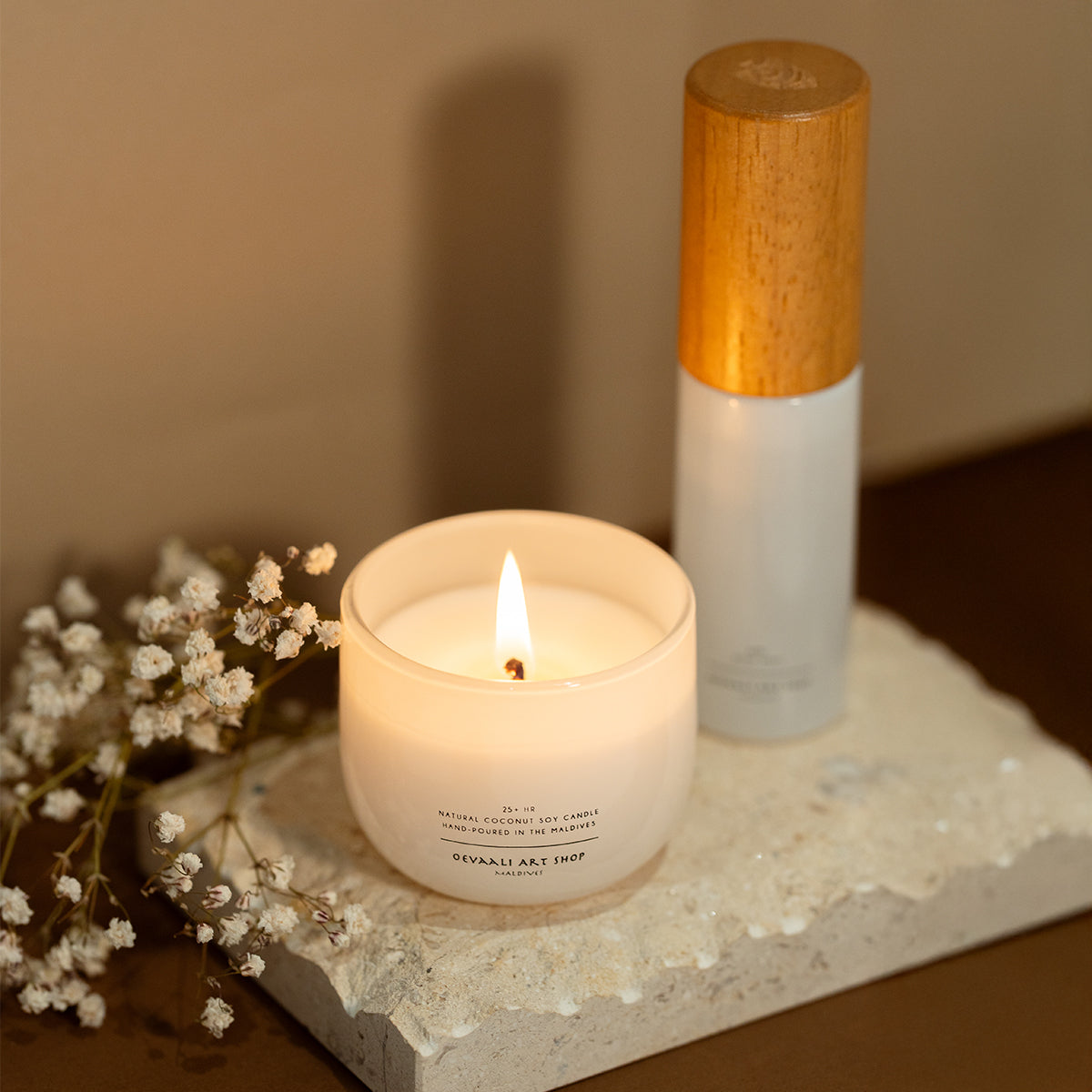 Crafted with 100% natural coconut soy wax and carefully selected premium oils, our candles are hand-poured in small batches at the Oevaali Art Shop in Male’, Maldives. These rustic candles will infuse your senses and take you back to an uplifting Maldivian calm.