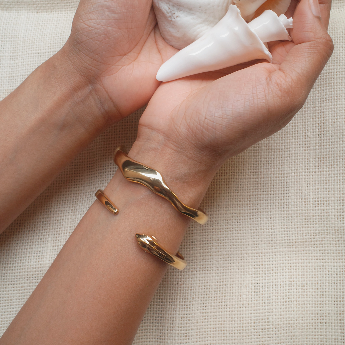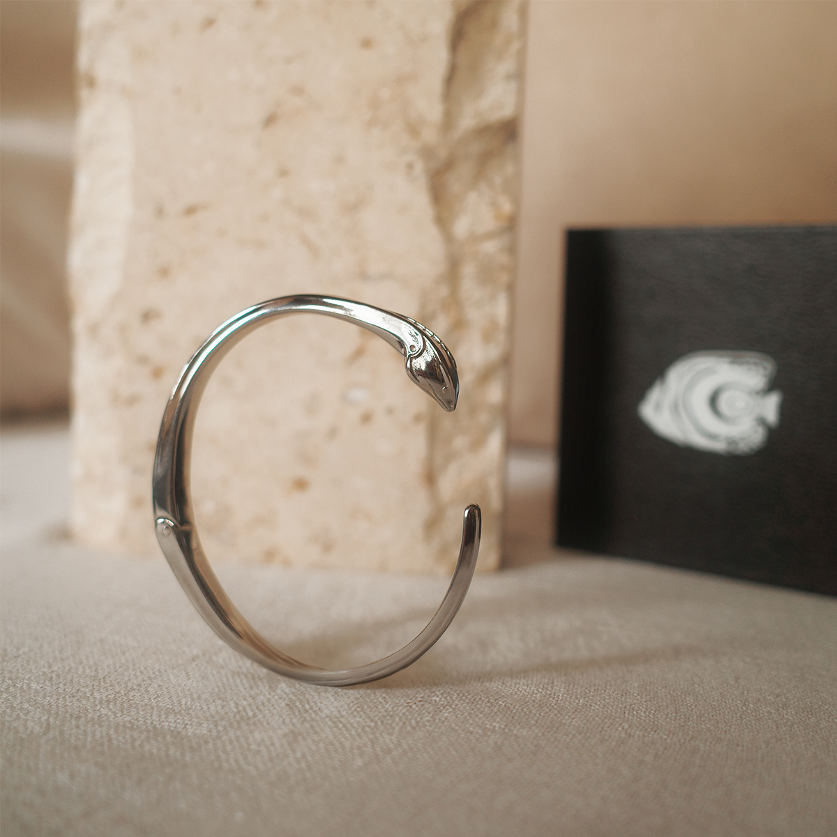 Unit price / perSlithering through the cracks and crevices of the reef, Moray Eels are among the most ancient creatures inhabiting our waters. These dragons of the deep, its serpentine form and formidable beauty, have thrived in the timeless oceans and volcanic landscapes that gave rise to the Maldivian islands. It is easy to envision our early islanders weaving tales of sea monsters, inspired by these enigmatic reef dwellers. The Moray Cuff, crafted from stainless steel with a secure hinge connection, captures the elegance and strength of its namesake, blending power with sophistication.